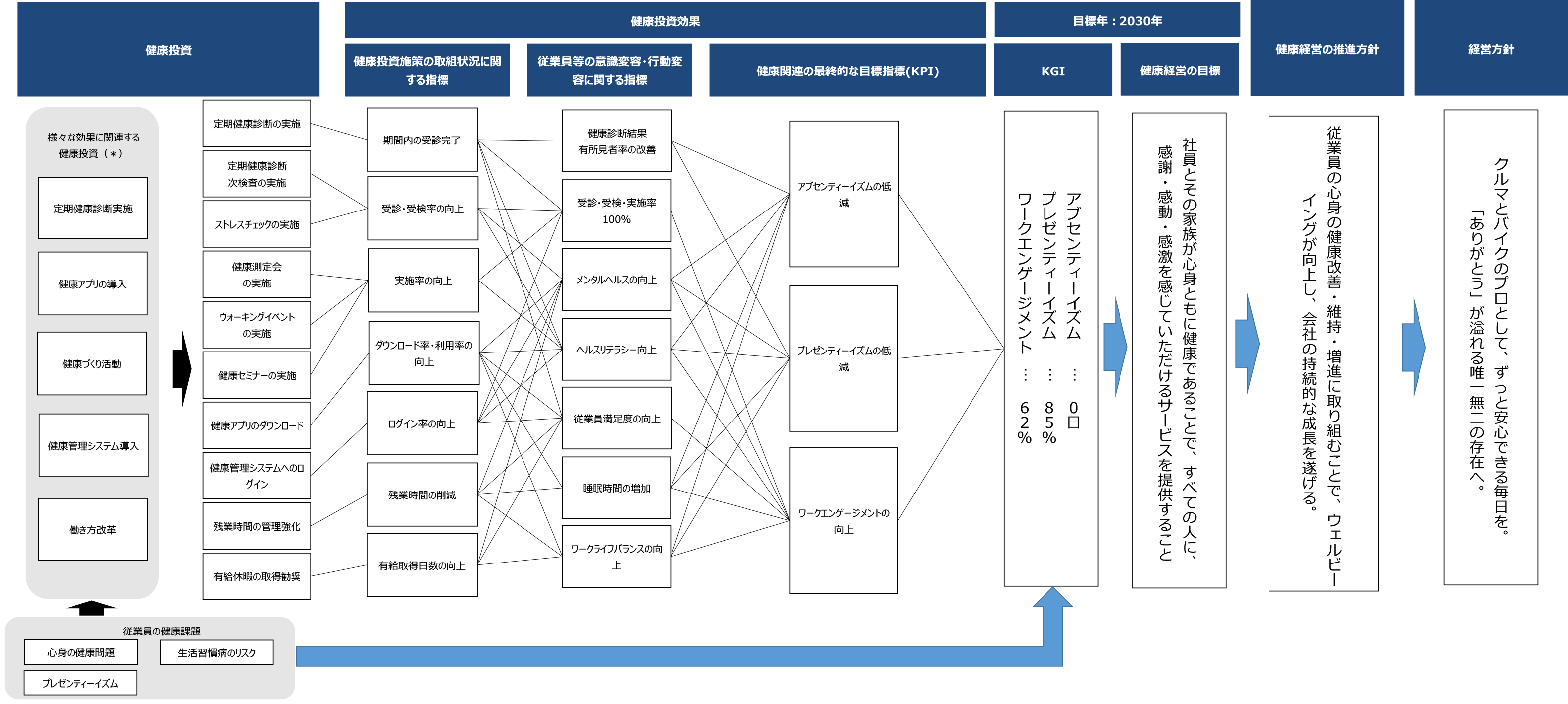当社は、新車・中古車販売並びに安心・快適・楽しいカーライフの提供を通じて、当社と接するすべての人に、感謝・感動・感激を感じていただくことに、大きな価値観を持っています。そして、当社とお付き合いいただくことに心から満足いただき、末永く、私たちのサービスを利用していただけるよう取り組んでいます。安心・快適・楽しいカーライフの提供を行うのは、グッドスピードの従業員です。従業員の健康づくりは、企業活動の要であり、従業員が健康であってこそ、お客様に感謝・感動・感激を感じていただけるサービス、末永く利用していただけるサービスを提供できるという考えのもと、健康経営を推進しています。